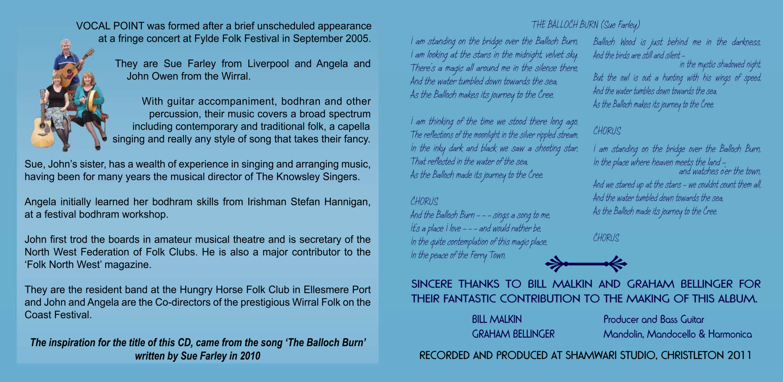 John eventually had to leave this arrangement but, coincidence occurred again when it was not long before the then licensee of the Rake pub, Little Stanney (a Hungry Horse establishment) asked him if he knew anyone who would like to run a music night. Accepting the offer immediately, the resident band Vocal Point was formed consisting of John, his wife Angela and his sister Sue Farley. The folk club was so popular that when offered improved larger premises his Hungry Horse Club moved to The Whitby Club, Ellesmere Port.